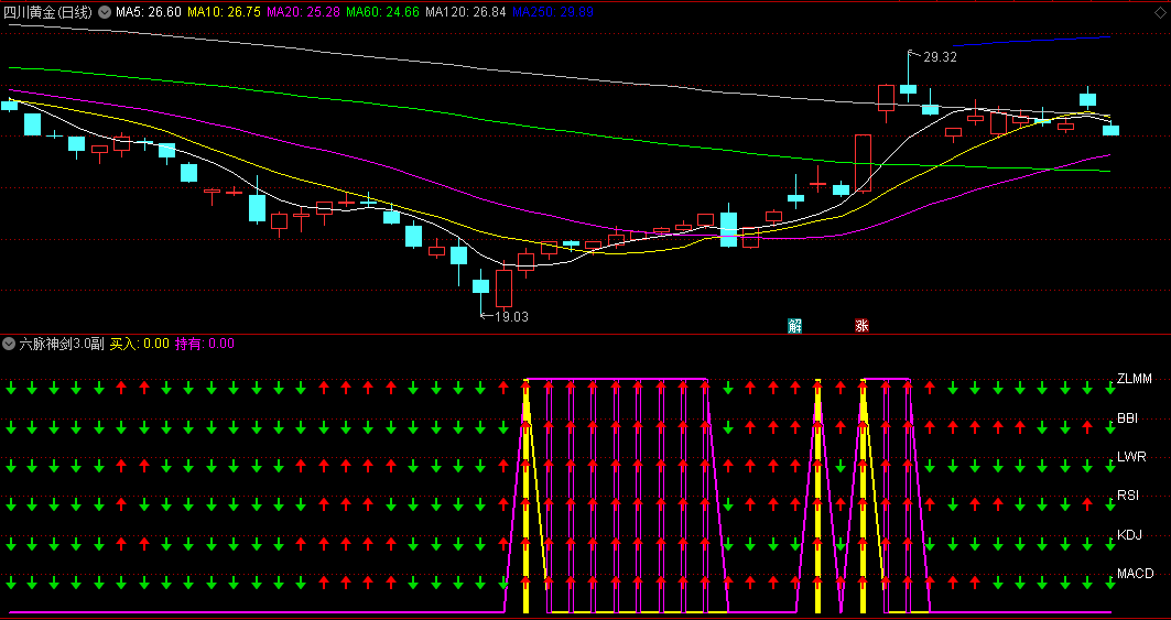 1、六脉神剑指的是MACD+KDJ+RSI+LWR+BBI+ZLMM,这6个指标同时共振出现的买点信号。