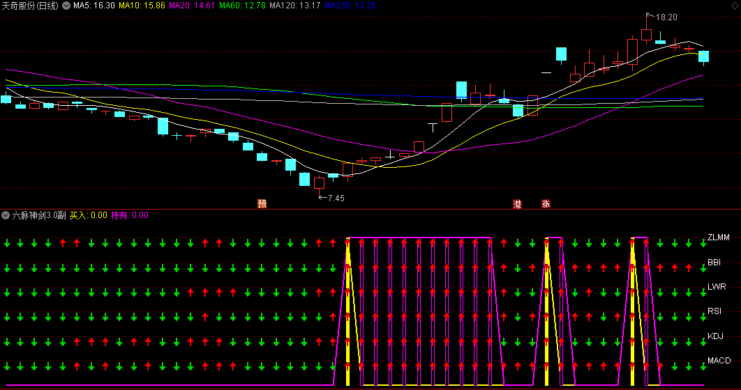 2、六脉神剑3.0版本,也算是在上一版【六脉神剑】指标基础上优化而来,并增强了捕捉信号的敏感度,提高了成功率。