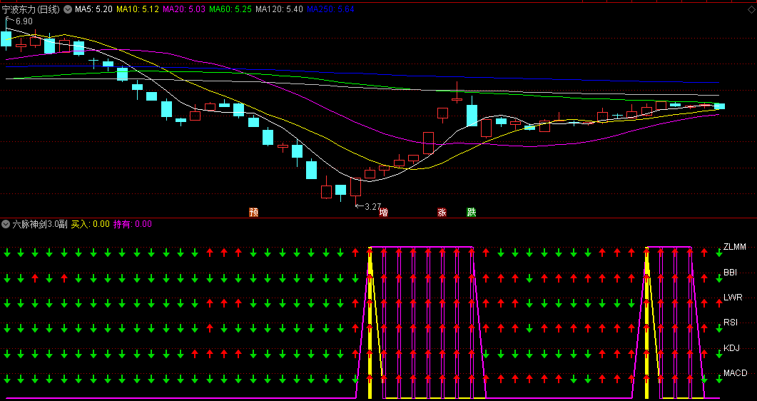 3、六指标同时共振买入时,显示“红箭头”同时向上,并带有“黄柱”买入信号;洋红色覆盖表示可“持有”的天数。