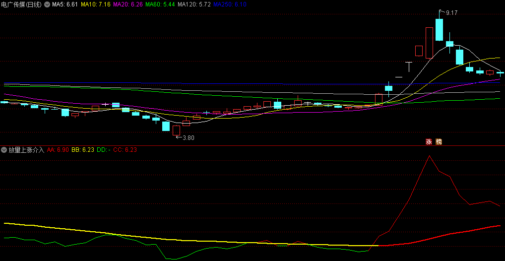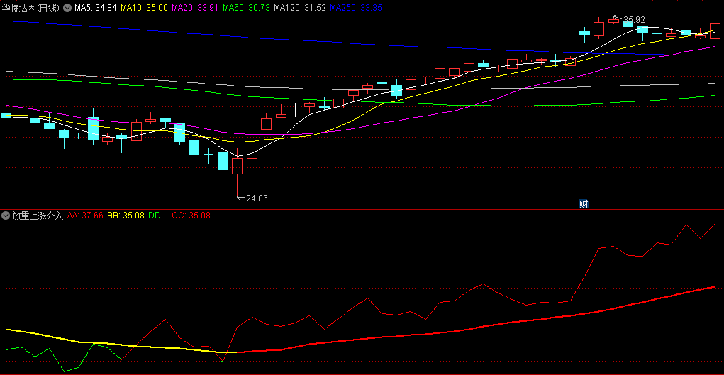 为了更准确地判断主力资金的参与情况,我们可以利用放量上涨介入点指标。这一指标由长期主力线和短期主力线组成,通过它们的颜色和形态,我们可以分析出主力资金是否参与以及参与的强弱程度。