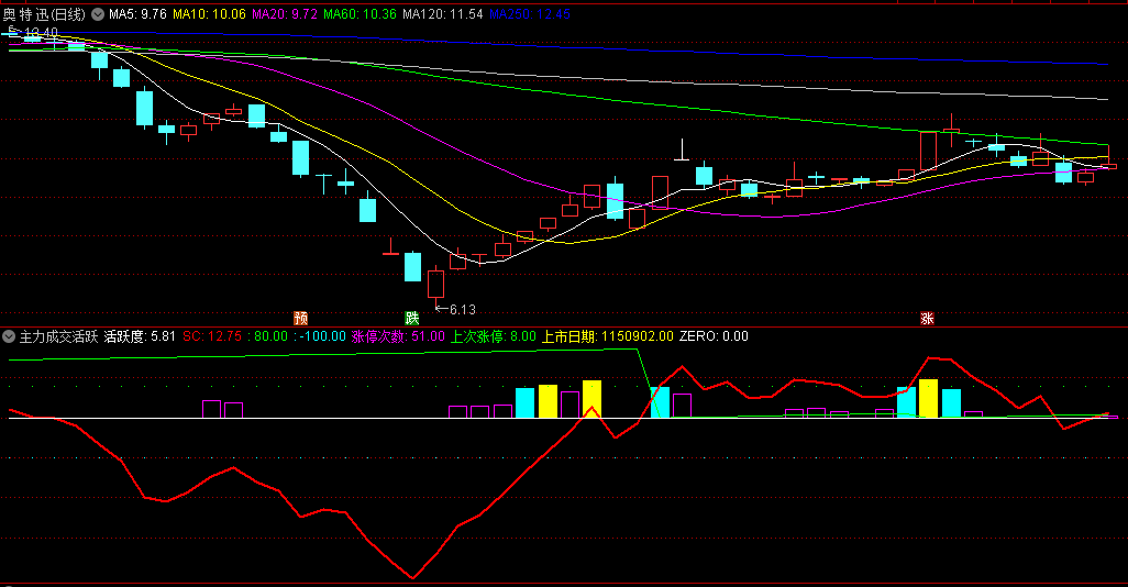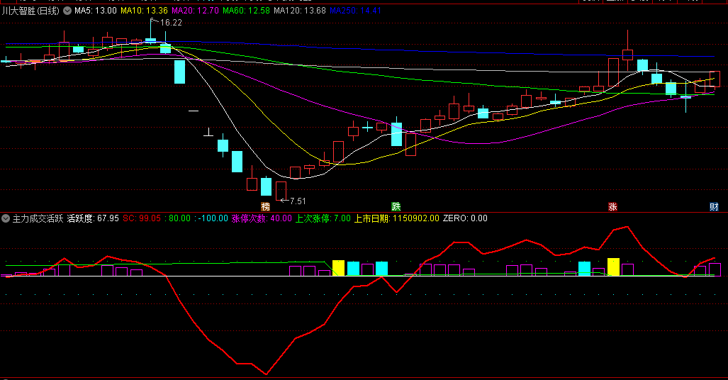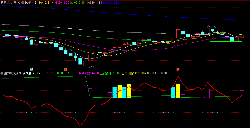 〖主力成交活跃度〗副图指标 橙蓝紫三种柱子 代表不同活跃度 通达信 源码
