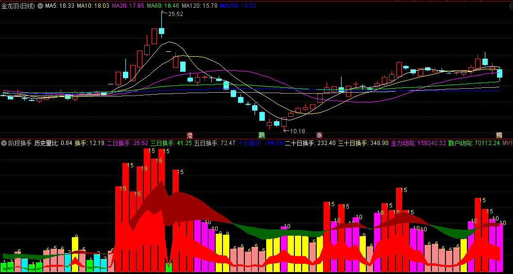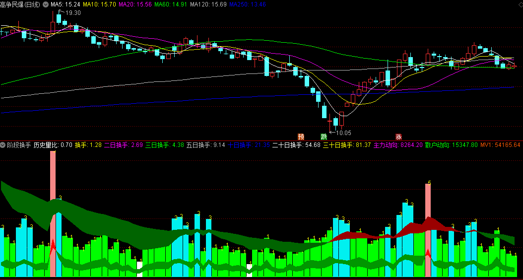 编写了一个最新版的阶段换手指标,思路就是以换手率为主要导向,用不同颜色的柱子和彩带做出标记,方便大家对趋势做出判断!!!