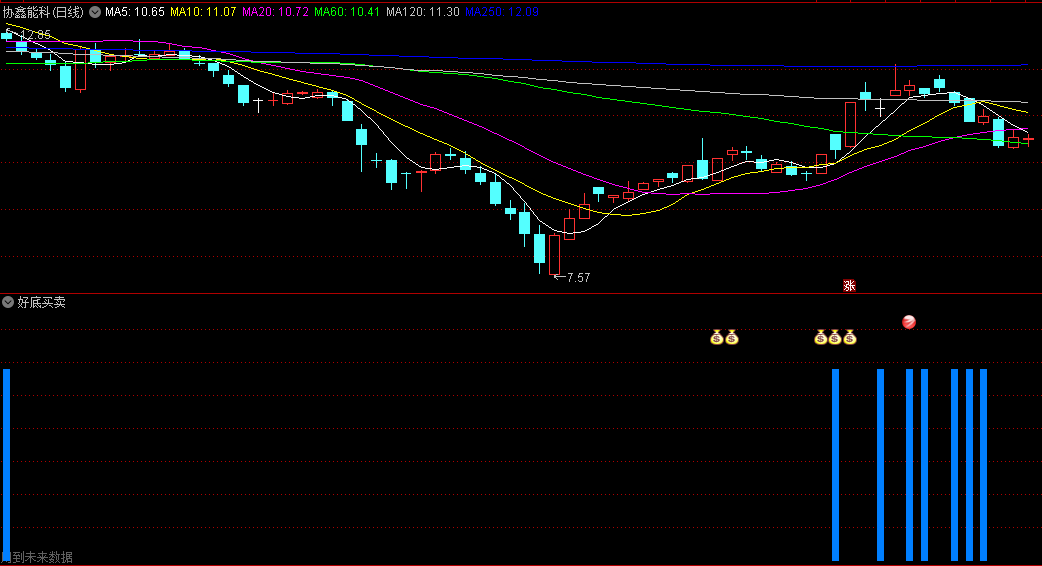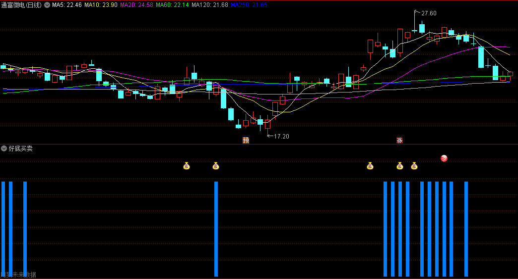 神奇的〖好底买卖〗副图指标 蓝色柱子出现红球和钱袋子 是进击信号 通达信 源码