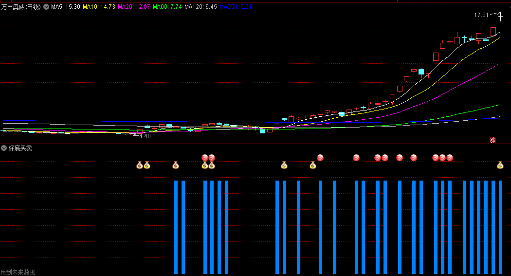 当指标中出现蓝色柱子上有红球和钱袋子特征时,就是进击信号。
