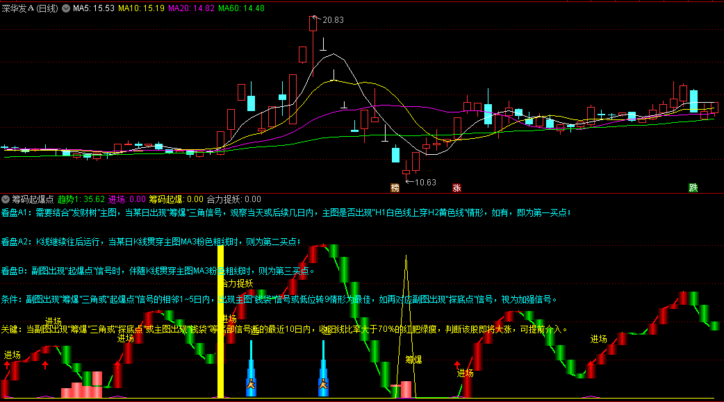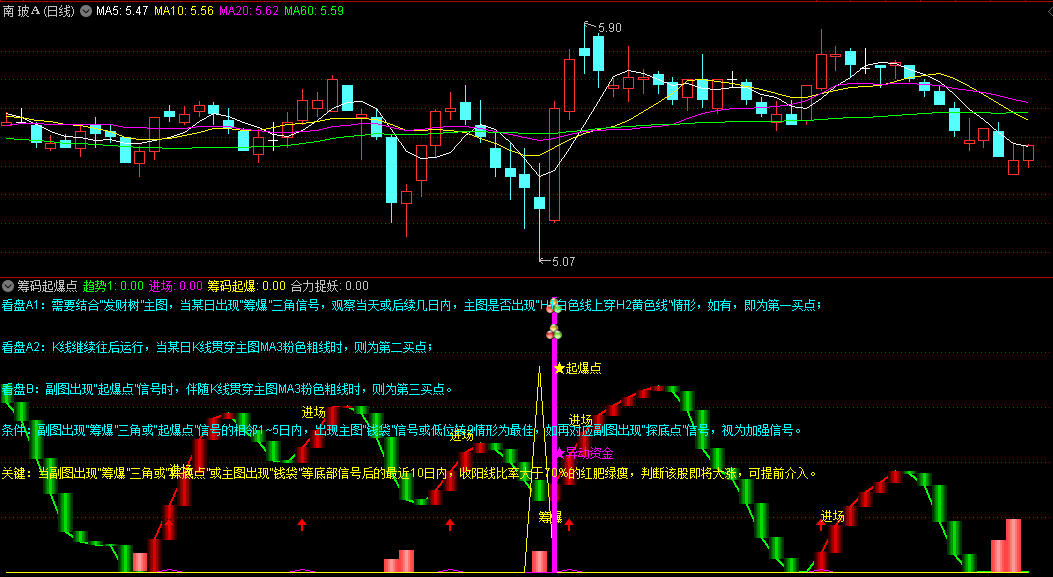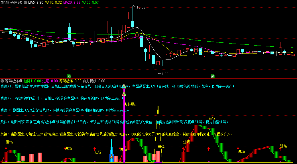 9. **筹码起爆**:这个指标结合了多个条件,包括价格的最低点、资金流入情况和价格的变动,当条件满足时,认为筹码可能会起爆,即价格可能会有大幅上涨。