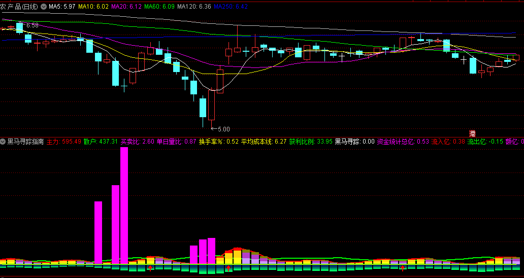 1、观察洋红色宽柱:它是主力潜伏的迹象。虽然不代表股价立即上涨,但足以引起我们的注意。