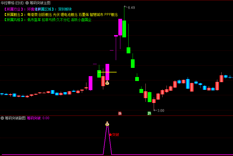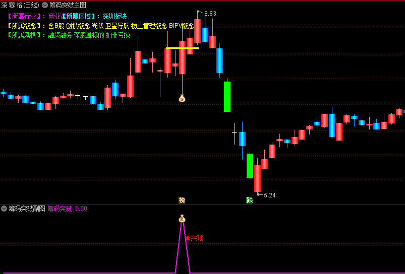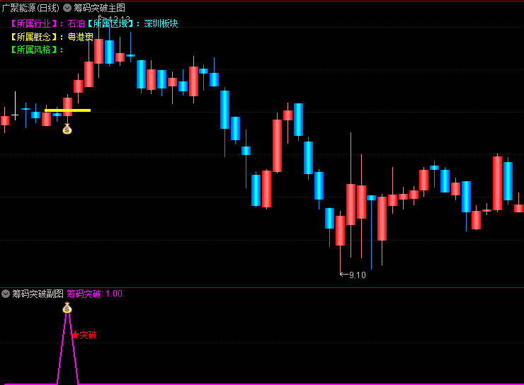 当股价突破筹码获利比例大于85%、筹码集中度小于20的条件时,显示“钱袋子”信号,做了一根黄色的横线,用于突破标识。