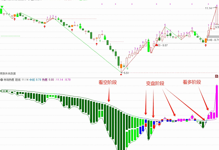 看空阶段,绿色柱体的高度越高市场压力越大,柱体呈减弱的趋势并转换成蓝红,需要注意个股可能点燃做多的热情。