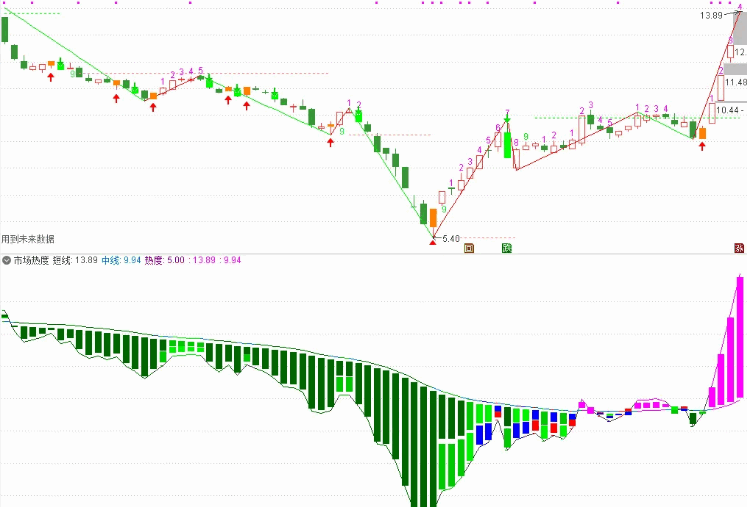 在看多阶段时,洋红色柱体高度代表着市场参与的热度,当柱体呈阶梯状增高时,股价走强趋势越明显,当柱体由洋红色转为蓝红时,可能会出现变盘信号。