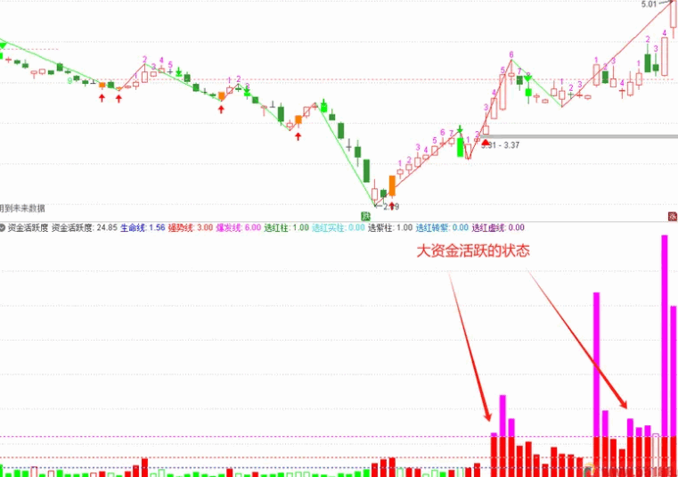 用柱形表示大资金活跃度,活跃度越大,大资金操作买卖的量越大。