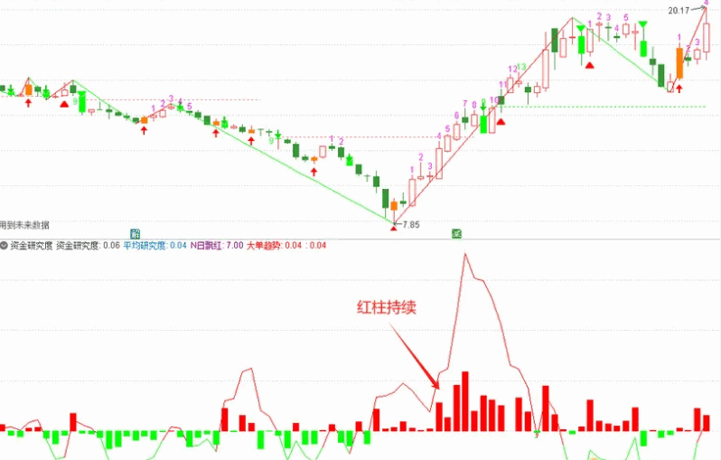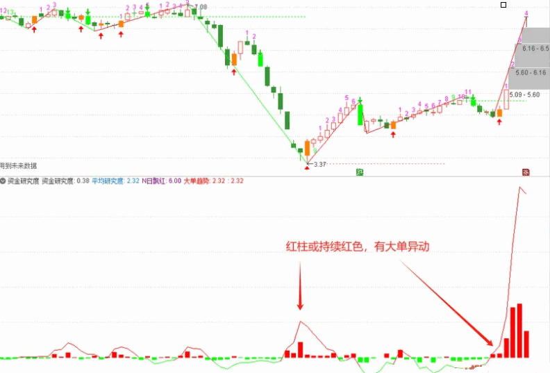 用柱形表示大资金的研究度,研究度红柱越大,代表大资金对个股的关注度越高,个股大资金做多潜在可能性大。红绿曲线为平均研究度,出现连续红柱且红线持续在0轴上方时,个股的持续关注和研究度越高。柱体为绿色代表当天大资金对个股的关注和研究度低,个股大资金作多潜在可能性小,绿线持续在0轴下方并且研究度出现连续绿柱时应规避风险。