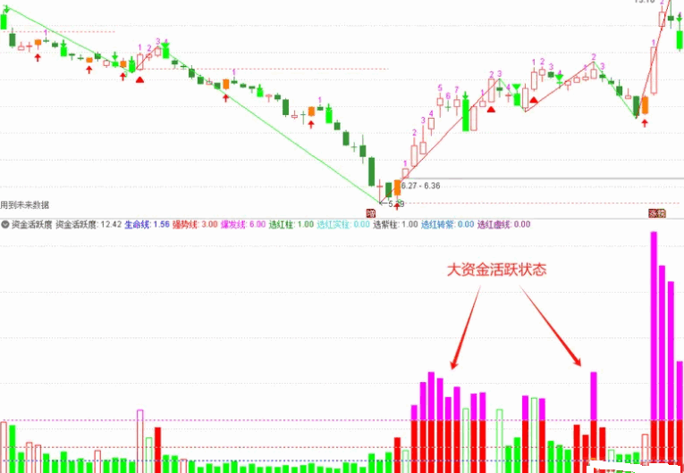 生命线是个股短期有无活跃大资金操作的分界线。大资金活跃度低于生命线时,个股短期缺乏大资金操作:个股处于下跌趋势时应规避继续阴跌的风险;个股处于重要支持线上缩量横盘时也可能是大资金锁仓行为,当活跃度再次大幅放量时,可能是二波行情的起涨点。