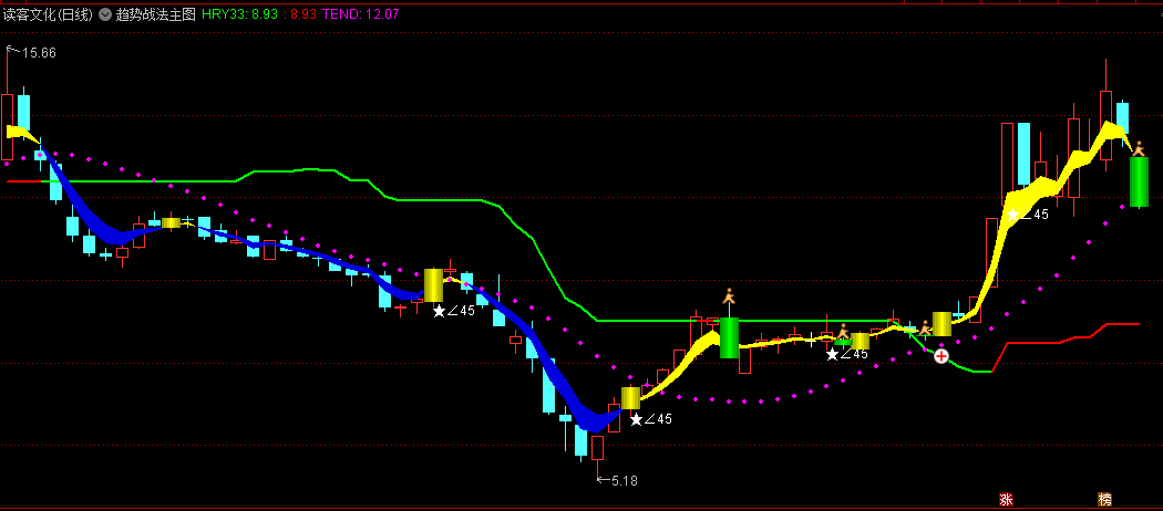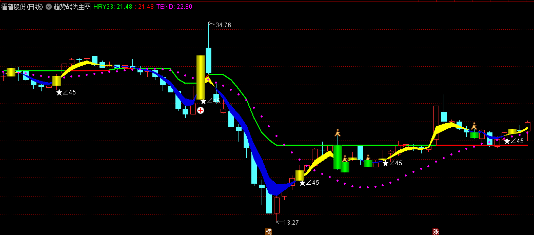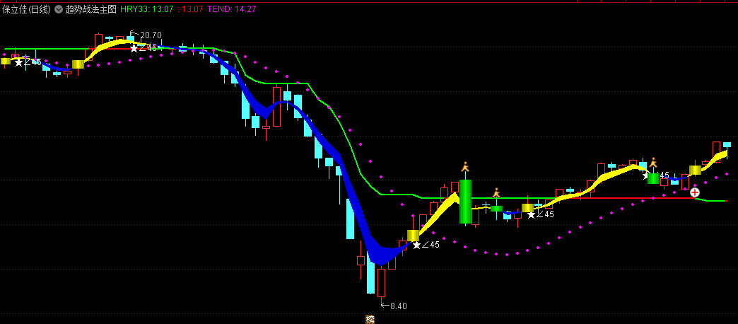 2. **HRY33**:这是HR和HRY的乘积的平方根,用于生成一个动态的阻力线。如果当前收盘价高于这个阻力线,并且该阻力线比前一天高,那么在图表上会以红色线条显示。