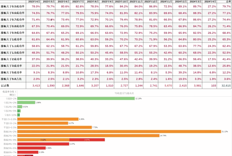 PS:上面表格能很好的把在统计周期内相应冲高点位概率直接量化出来,这样既有第二天冲高概率统计,又有具体获利点位概率的量化结果;大家都能真正做到心里有底,可以根据以上统计让自己大概能知道第二天操作到什么位置就能止盈或者止损。