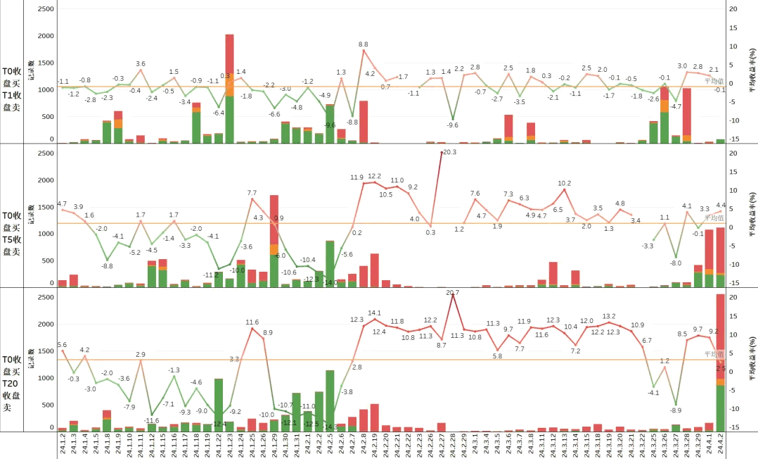 3)最近几月每日出股数及平均涨跌幅(红柱为每日成功信号,绿柱为每日失败信号,折线为每日平均盈利)