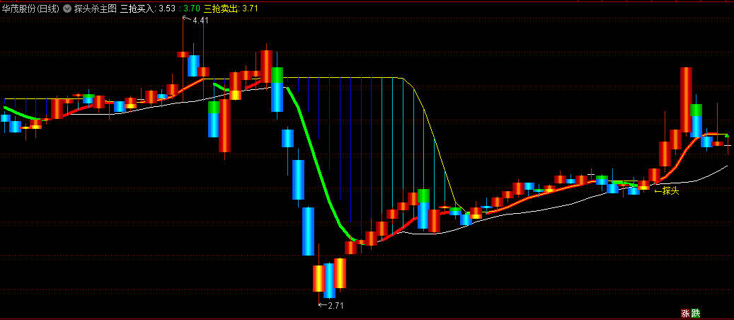 4、K线颜色的变化。在探头杀里面,有四个颜色。通过颜色的判断可以看出该股分时图是低开高开,还是高开低走。红色代表的是上涨,蓝色代表的是下跌。而黄色代表的是低开,绿色代表的是高开。