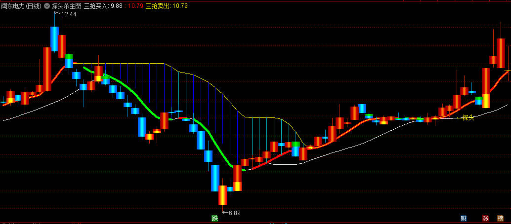 2、白色线买入,黄色线卖出。通过该指标能够很好的找出一只个股的支撑和压力位。也就是咱们说的买入和卖出价位。白色的那条线称之为买入线。当个股成功的突破压力后,而该股下方出现白色线的时候,就是介入时机。在白色线之上的K线,都可以进入。
