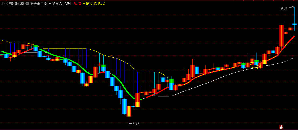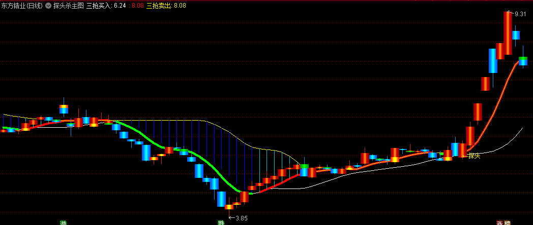 今天给大家分享的指标名为“探头杀”主图指标,包含选股指标,指标没有未来函数。该指标主要是教大家锁主力、庄家颈部位置,把握个股最佳的买入点和卖出点。在每一次起爆过程中,能够有效的把握住介入机会,在每一次主力洗盘过程中,控制好风险,找出支撑和压力部位。下面介绍指标使用方法:
