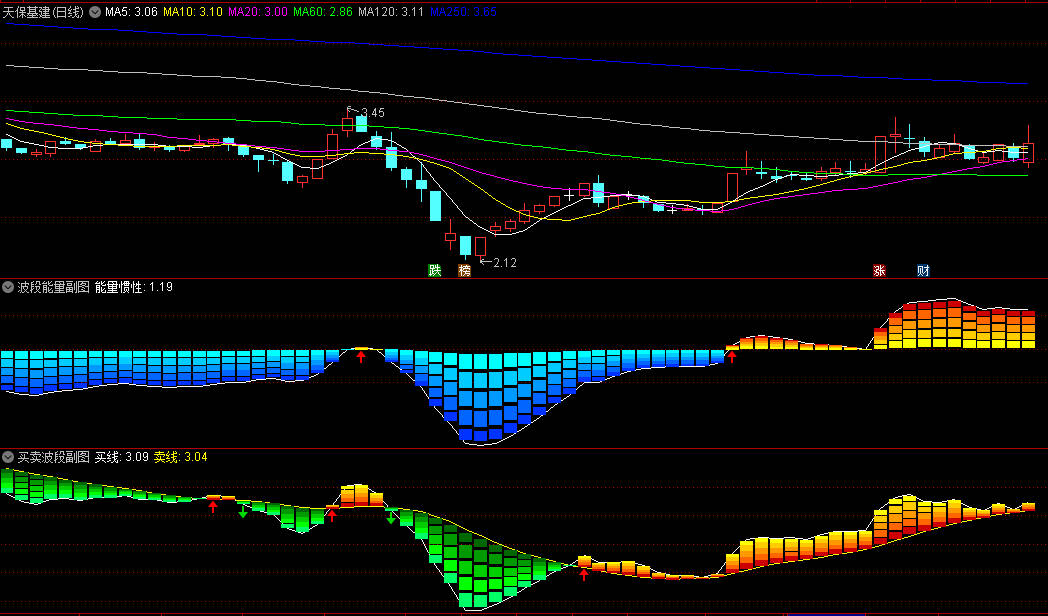 4、两个副图指标同时出现红色箭头为最佳介入信号,红色箭头间隔不超过3天都可以介入,超过3天直接放弃。