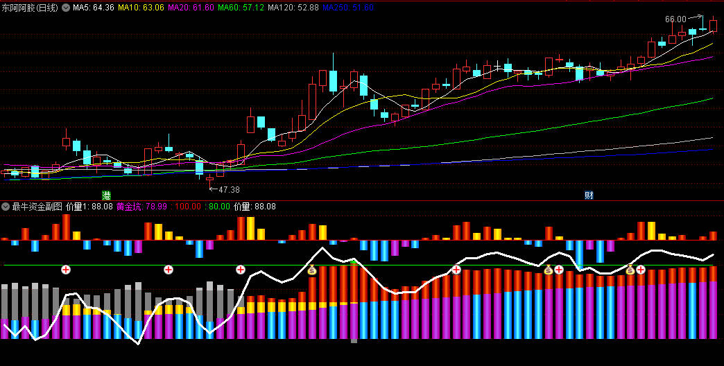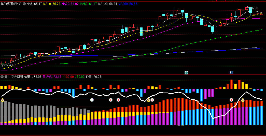 6、量价线上穿80号绿线显示“钱袋子”信号,以及快线上穿80号绿线,显示“➕”,均可重点“关注”。