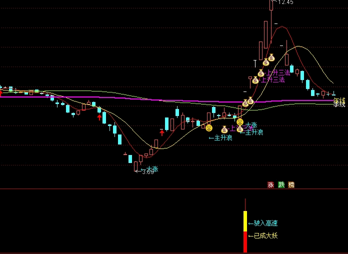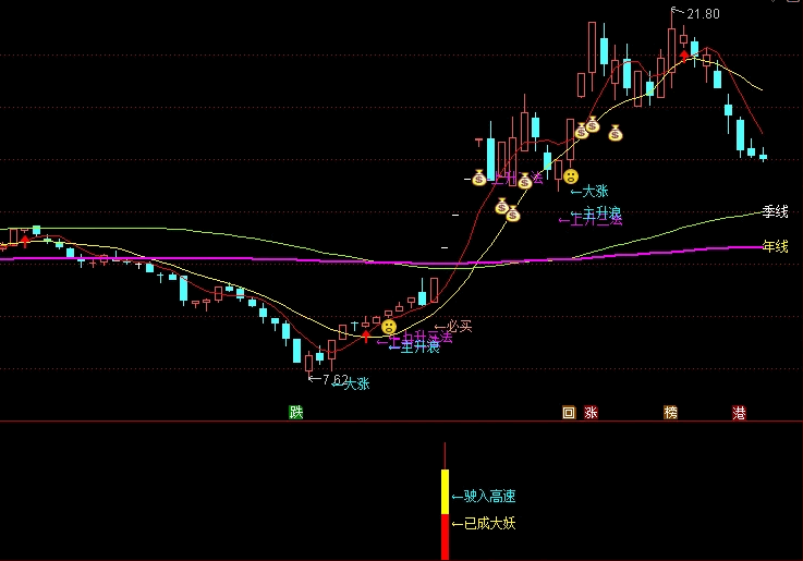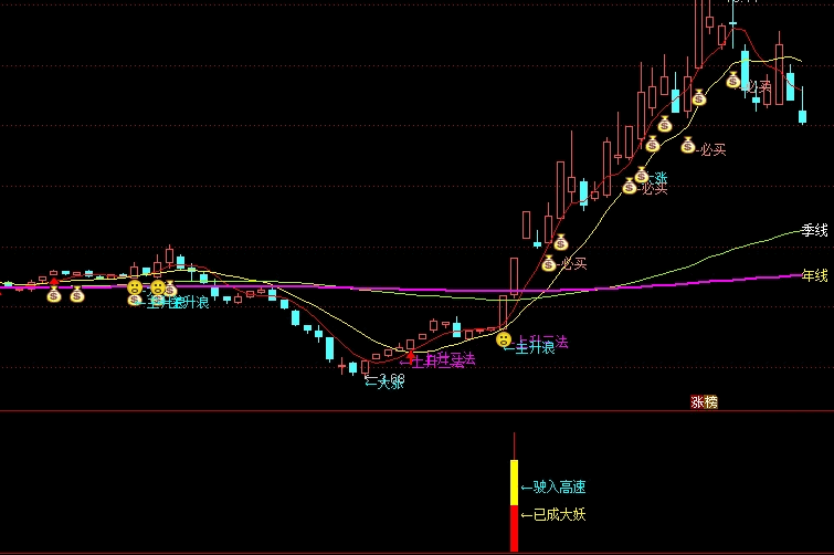 相反,若今日收盘价*1~2个涨停>今日的年线MA(C,250),则极有可能成妖;注意:若次日上涨的话,次日MA(C,250)一定小于今天的MA(C,250),于是我们大胆以今日的MA(C,250)为基准,经过我们结合上述推演、预演,以及前面提到的多种筛选条件,又加之我们对以前上百只龙头妖股的其他辅助指标、参数的抽算,如:EXIST(V<=REF(LLV(V,15),1),10) AND (REF(CROSS(MA(V,5),MA(V,60)),2) AND C<REF(C,1) AND EXIST(C<REF(C,1),2) OR ( CC AND C>REF(C,1) AND REF(C,1)<REF(C,2) AND REF(C,2)<REF(C,3)),我们泰宁路游资开发出了【坐上高铁指标】,详见每个附图的第二个指标。