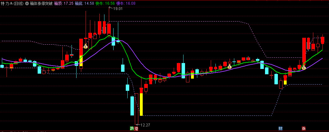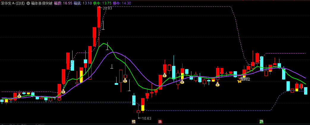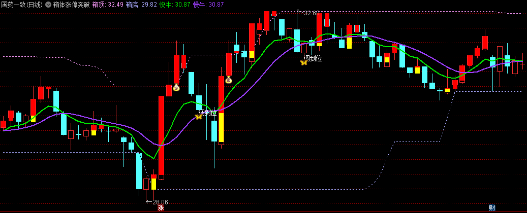 制作的是一款清爽版【箱体突破】主图指标,添加了宝塔线来预测底部和持骨区域;另外添加了组合K线的信号提示