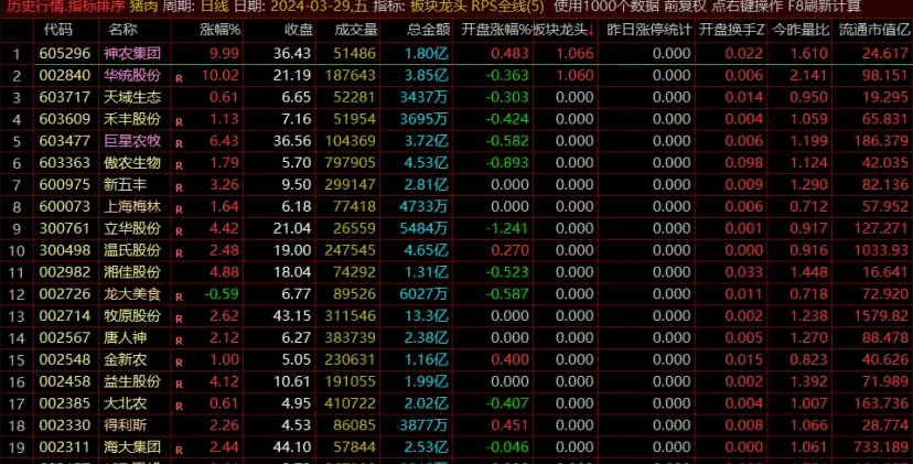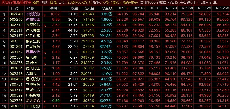 上图为本周五猪肉板块的情况,猪肉板块近期走势较强,收盘后的指标排序情况,大体而言,如果想参与,主要从排名前10里寻找龙头。