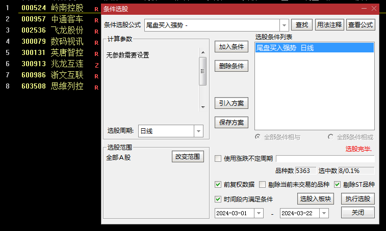 今天找到一个尾盘选股公式,整理资料时找到的,尾盘前30分钟进行选股。