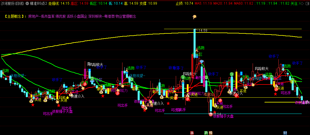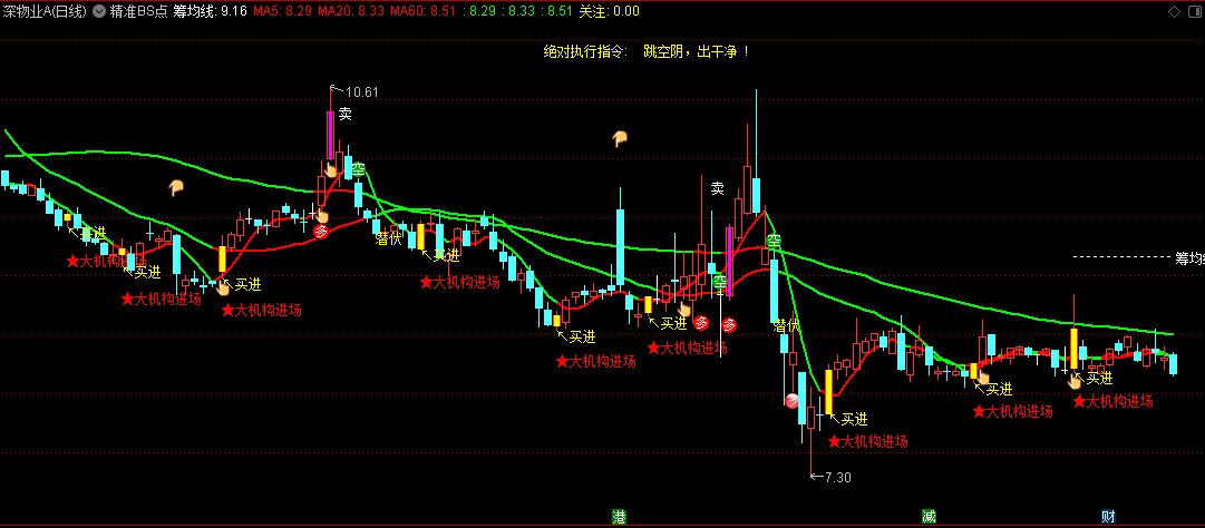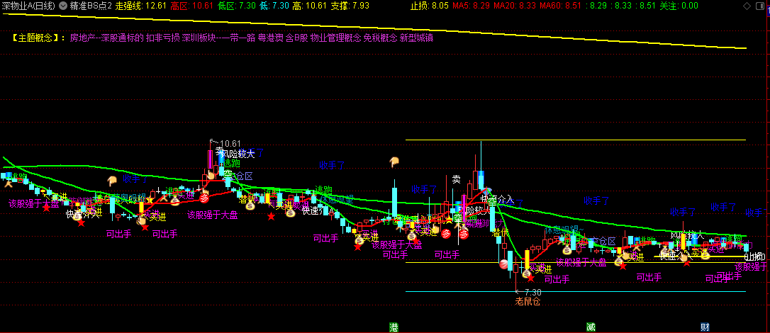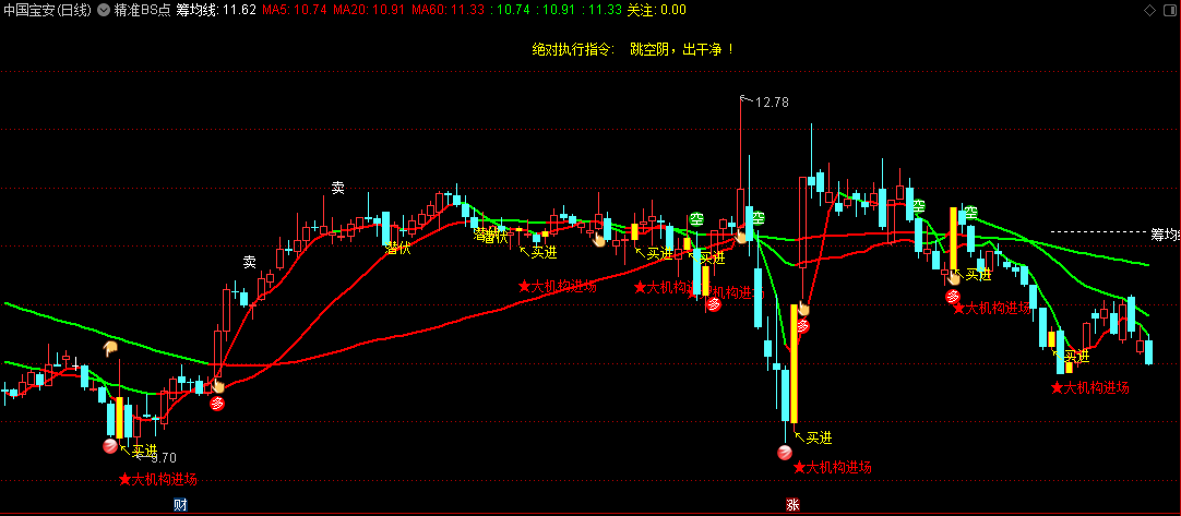 这个主图指标蛮有价值的,尤其是那几个数据对超短线、激进选手的参考价值挺大的;潜伏、买进、钱袋子等信号对波段选手来说意义非凡,这就是波段、中长线朋友的宝贝,长期追踪的个股,出现信号可以根据自己的系统,参考决策后自己决定是否分批买入,吃肉有较大的可能性的。就写那么多,剩下的自己去研究吧。