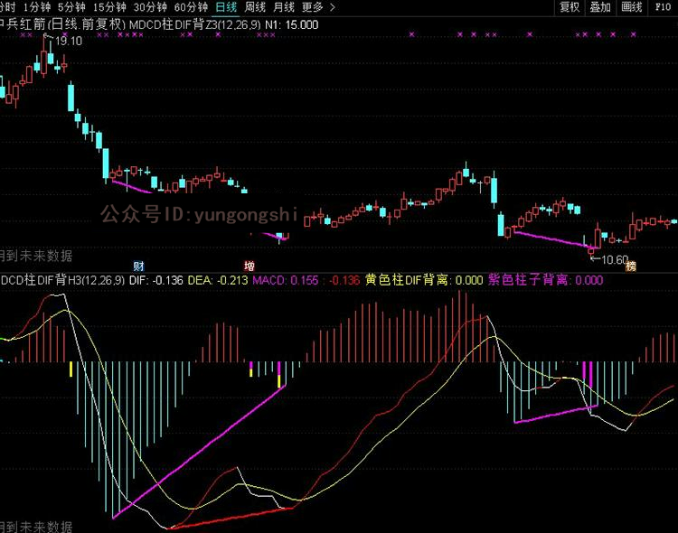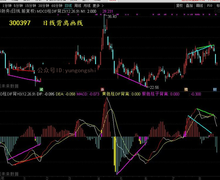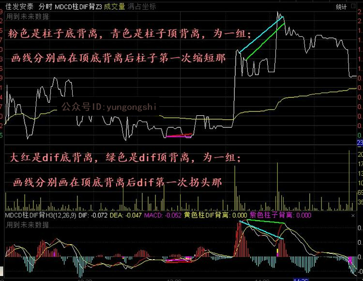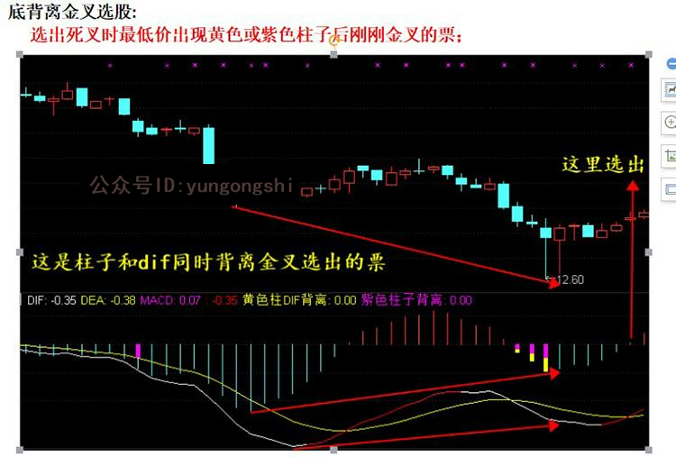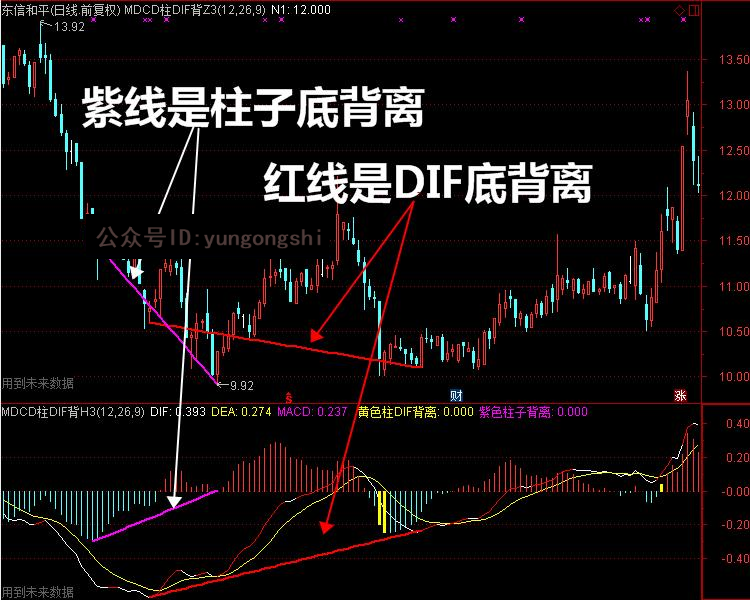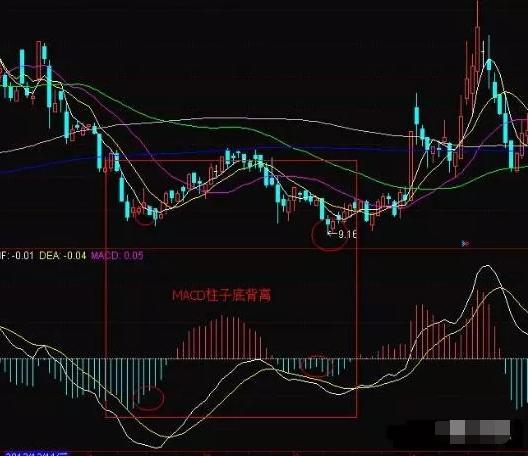 通常情况下MACD柱子出现背离现象要比DEA早,随后才会出现DEA的见底反弹。所以说MACD柱子的底背离更灵敏。底背离形态常常配合的是成交量的萎缩。如果随后出现成交量放大,股价上涨,那么此时的看涨信号更强烈。