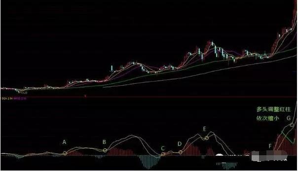 ABCD四点都是水上金叉,不过各自表现都不相同。我们从多空能量上去比较,观察红绿柱情况。A点之前多头变强,空头变弱,得到拉升。B点之前,空头变大,但是多头力量变得更大,这次拉升更加有力度。C点之前多头变大,但是空头更加大,所以这个金叉拉升很小。D点多头减小,但是空头极小,这个金叉拉升也比较大。E点之前多头变得特别大,空头也增长,拉升幅度也尚可,这个位置的高点,虽然没有发生顶背离,但是跟前面形成了双顶,风险极大,后面直接做了深度回调。F点虽然不是水上金叉,但是双双上0轴,最关键的是前面的空头大幅变小,多头也没变弱,得到了大幅拉升。而G点前面的回调根本就没有放出绿柱,MACD没有死叉就拐头向上了,而拐头前面的红柱异常大,多头力量很大,所以直接大阳涨停拉上去。