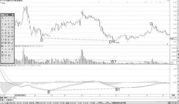2、DIF线低位背离:DIF线在地量底部出现期间形成背离,背离形态是确认买点的信号。在股价创新低的这段时间里,我们能够看到DIF线已经无法跌破前期低点,表明MACD指标首先触底,预示着股价即将大幅回升。
