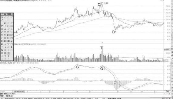 2、从DIF线高位背离来看:DIF线在G1位置反弹,却没有超过前期的G位置高点,表明MACD指标提示的顶部形态已经出现了。背离和天量顶部同步形成,这是考虑卖掉股票的信号。