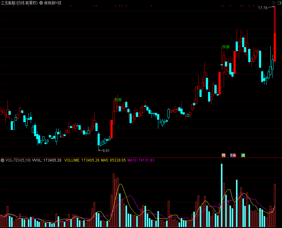 DRAWTEXT(REF(C,1)*ZTB-H<0.0049 AND H>C AND PERIOD=5,H-0.02,' 炸板'),COLOR00CC00;