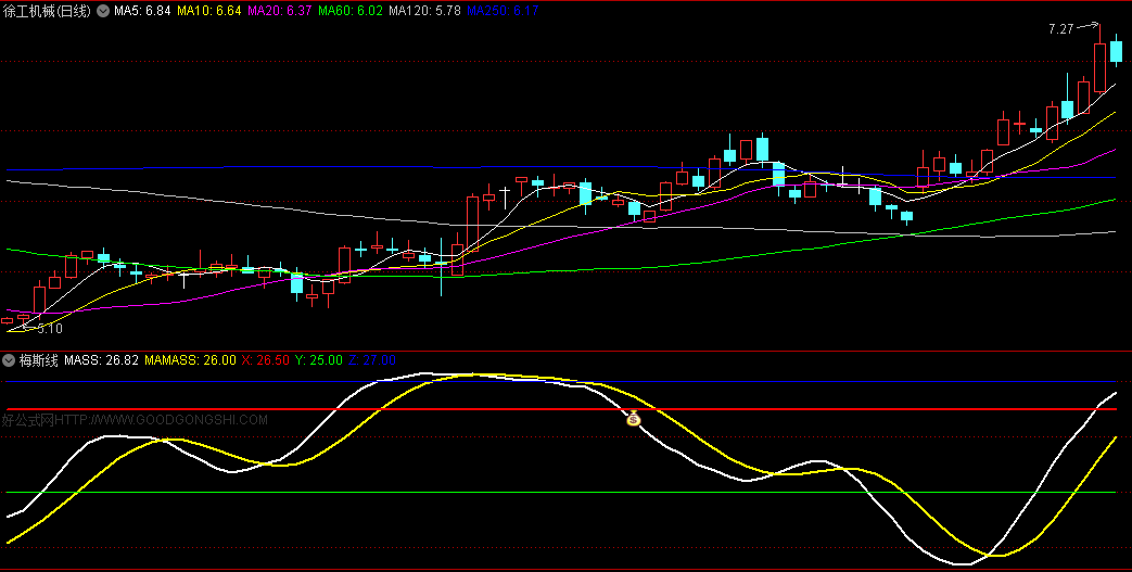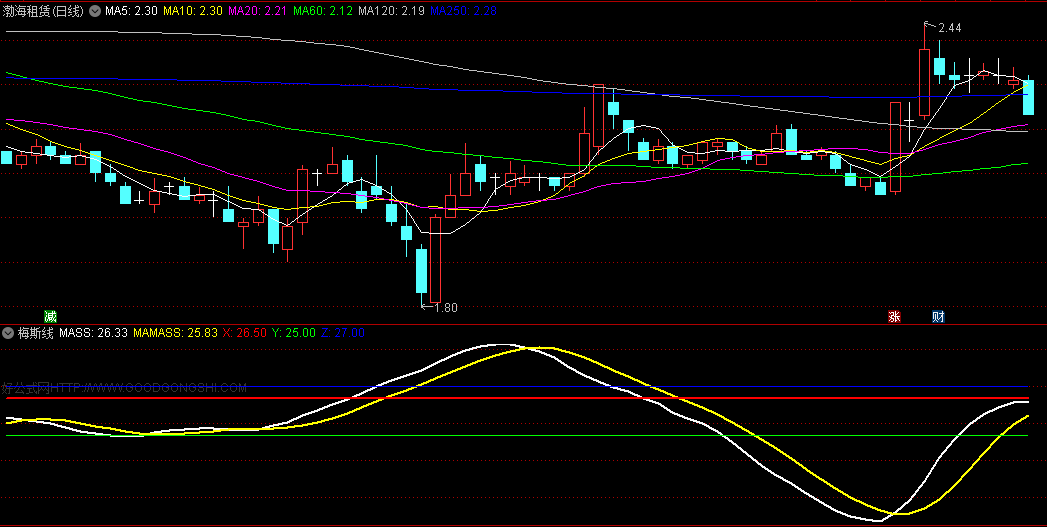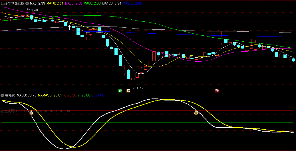 1、MASS曲线向上穿越27,随后又掉头跌落26.5。当时,如果股价的9天移动平均线,正处于上升状态,代表多头行情即将反转下跌。