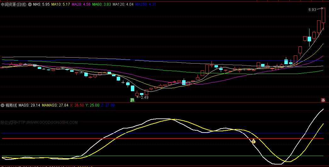 2、MASS曲线向上穿越27,随后又掉头跌落26.5。当时,如果股价的9天移动平均线,正处于下跌状态,代表空头行情即将反转上涨。