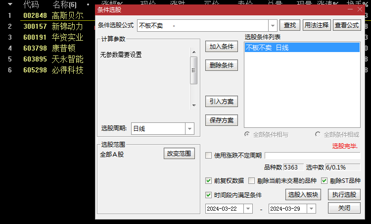 为了配合副图指标的使用,还有相应的选股指标。选股指标的主要作用是筛选出那些符合买入和笑脸标识位置的股票信号。