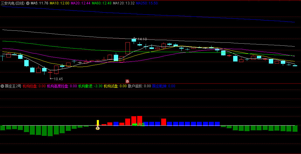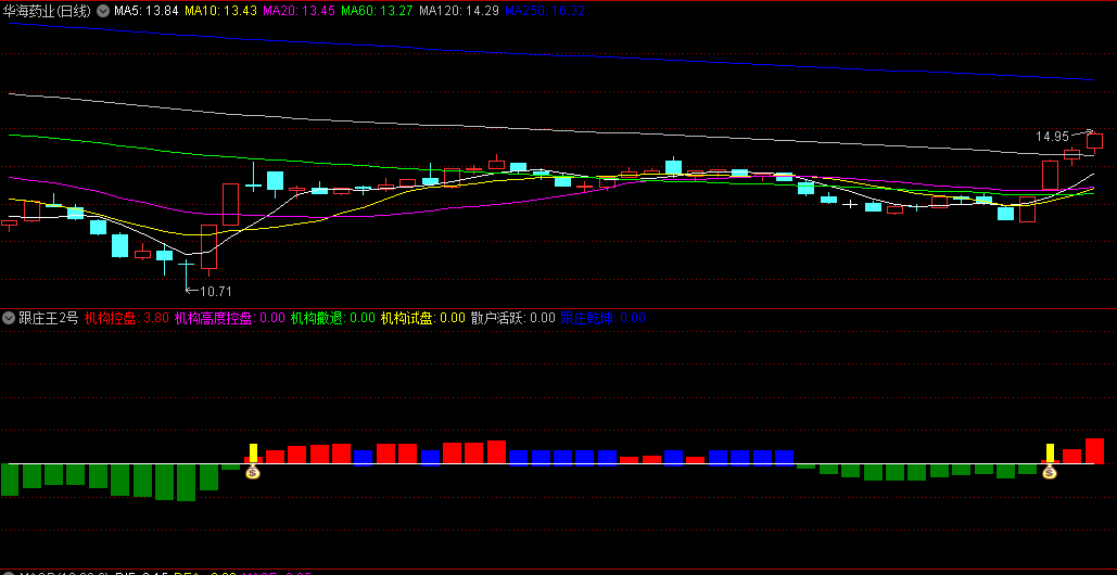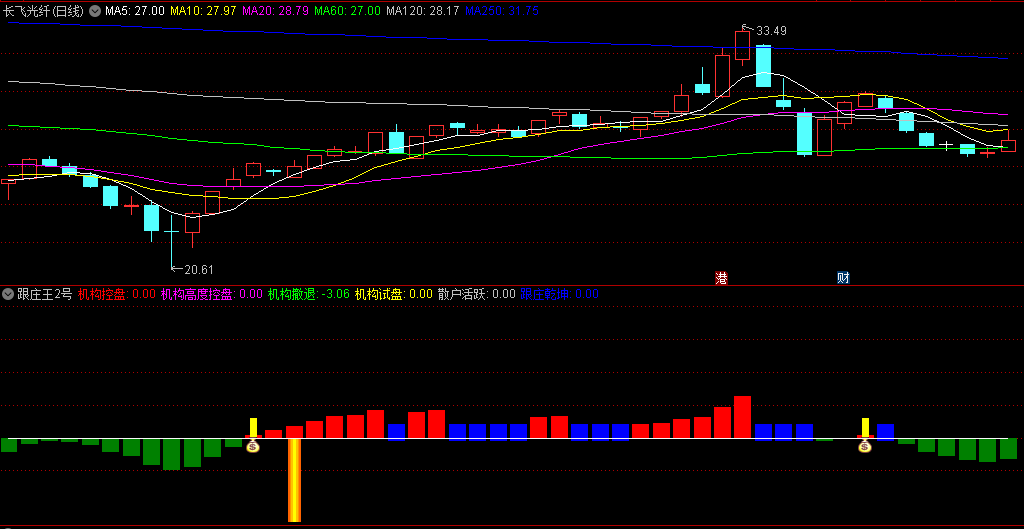 5、红柱为机构控盘;洋红色柱为机构高度控盘;蓝色柱为散户活跃信号;