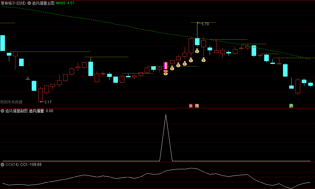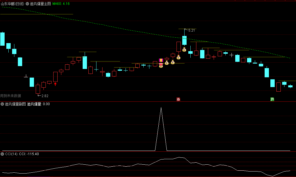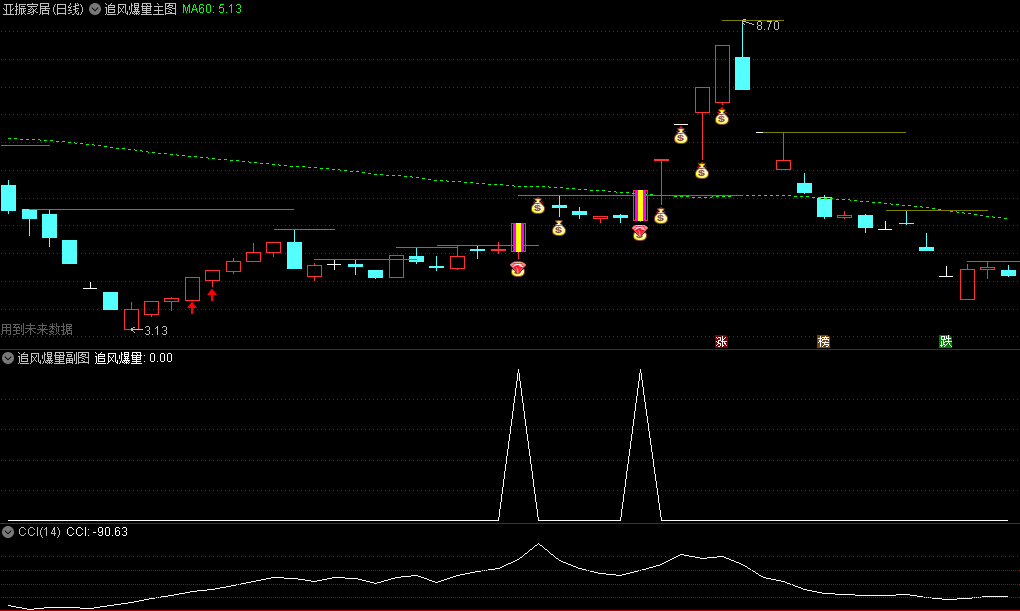 因为大部分的行情启动,均伴随着股价突破,主图中绿色虚线为MA60日线,放量突破+风口热点显示为“钻石+钱袋子”信号。信号可选股。
