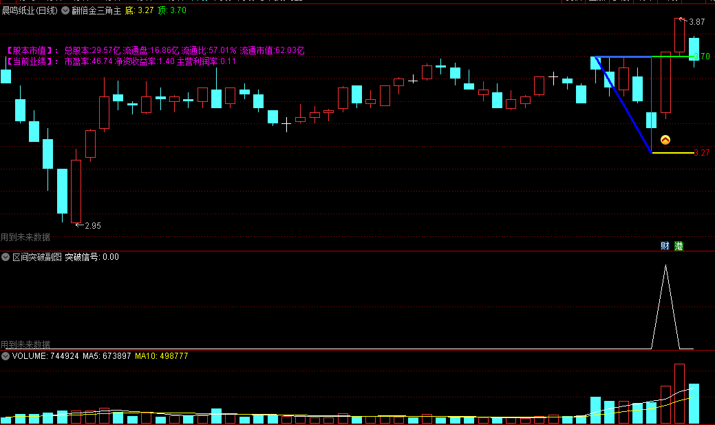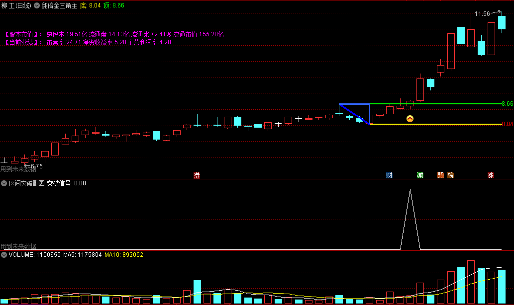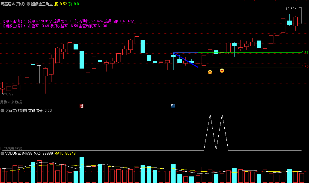 突破金三角,股价上涨动力强劲,可能走一波上涨趋势。