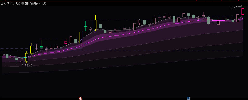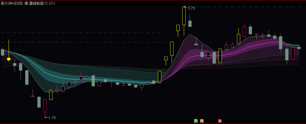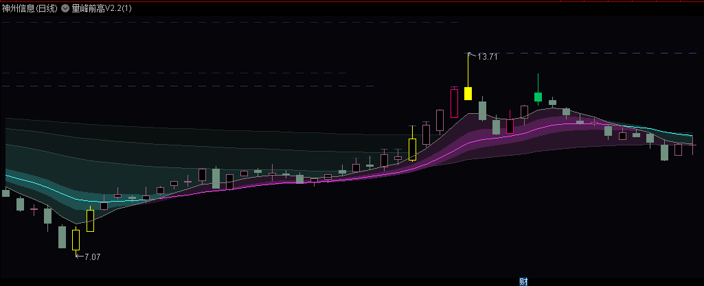 经过一段时间的市场实践(赚少亏多),我认为均线系统所假定的均线支撑和压力是不太真实的。在我回顾自己所写的筹码峰指标时,我才恍然大悟:均线支撑和压力的实际生效区域,实际上是量能密集区所处的位置。所以我开始深入研究前高线描绘的工程,经过多次尝试和调教,得到了目前这个效果。