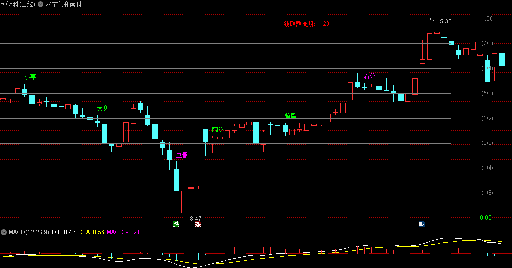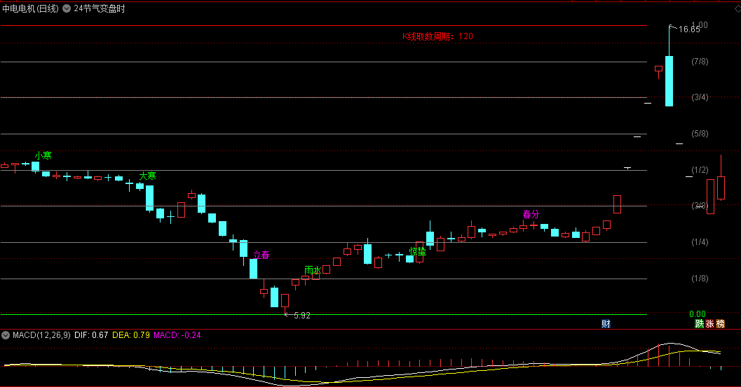 3、当24节气时间点、或日K线运行至江恩八分线附近时,结合所属板块的变化、以及小级别30分钟、或5分钟的走势形态,比如走势完美、顶底背驰,就可以加大在24节气的变盘可能性;这也是在24节气时间点,为什么有时候是当日、有时是推迟1天、或提前1天变盘,就是因为板块的运行时间点、以及该股不同小级别走势结构提前或推迟所致。