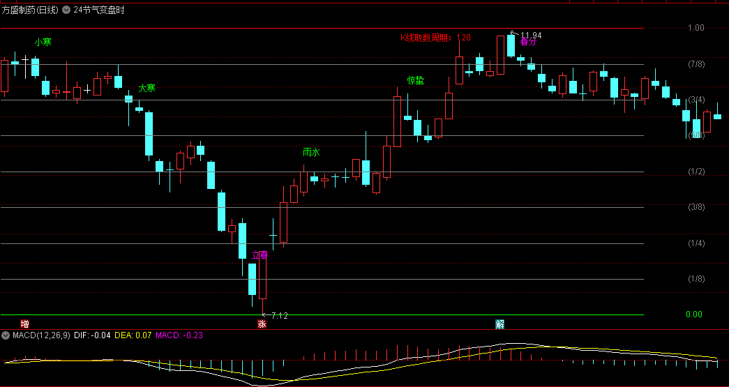 2、江恩认为,地球绕太阳公转,因为旋转角度不同,对证券市场的影响也是不同的,一个圆可以通过三分法、四分法、八分法作为不断循环的介入点,因此这些切入点,比如45度、90度、120度、180度、270度等等,变盘的可能性就较大。这里主图中,将24节气在这些重要的角度时间点,字体颜色标记为紫罗兰色;其他的24节气字体标记为绿色,当然不是说标记为绿色的24节气,就不重要了,只是标注为紫罗兰的时间点,变盘的可能性较大;