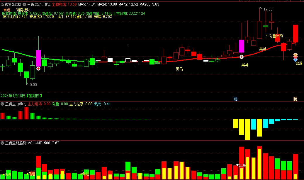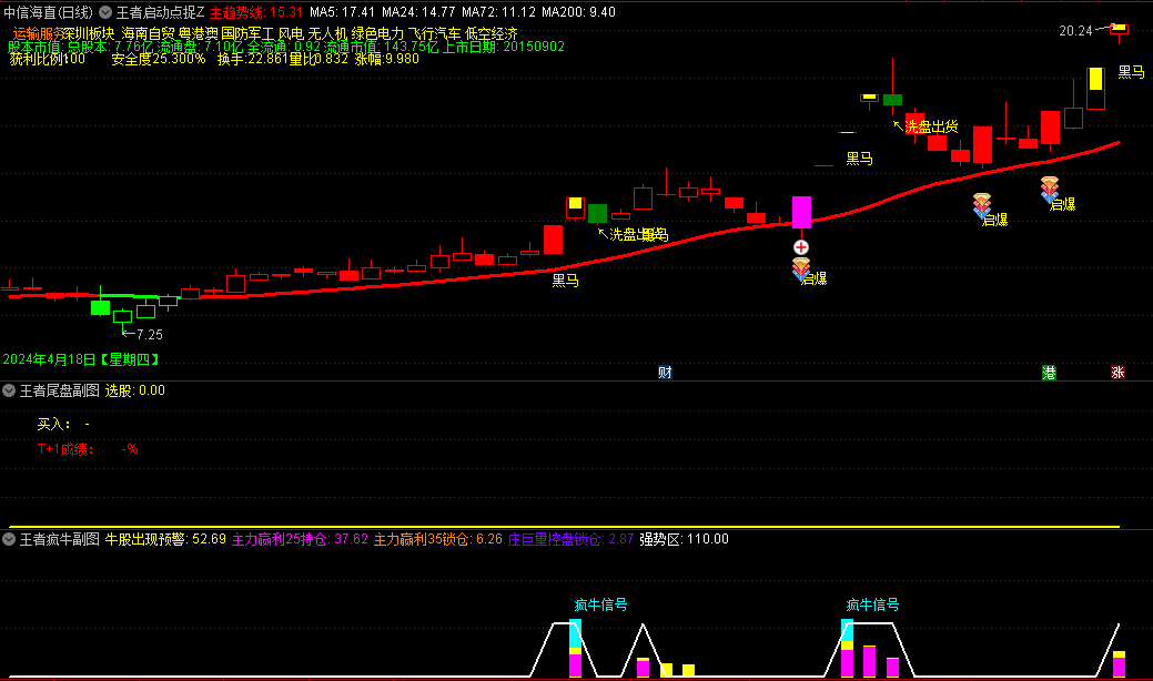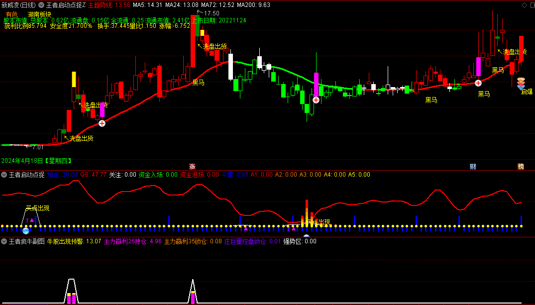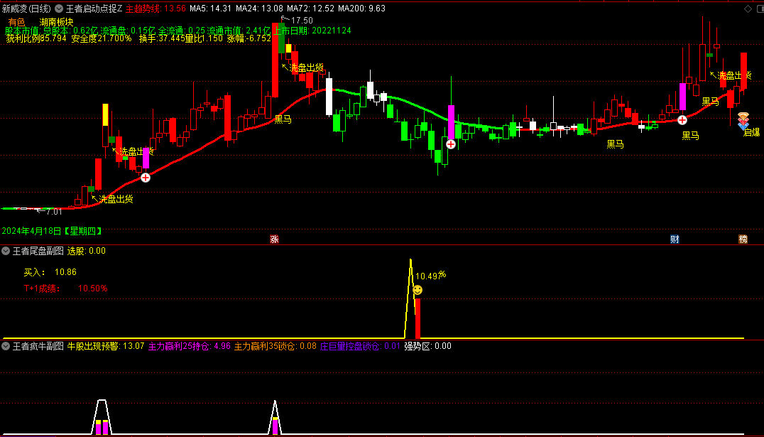 当主图显示黑马起爆信号时,若幅图中的“王者启动点捉妖”指标同时出现箭头信号,这将是极佳的启动点,意味着次日可大胆买入。