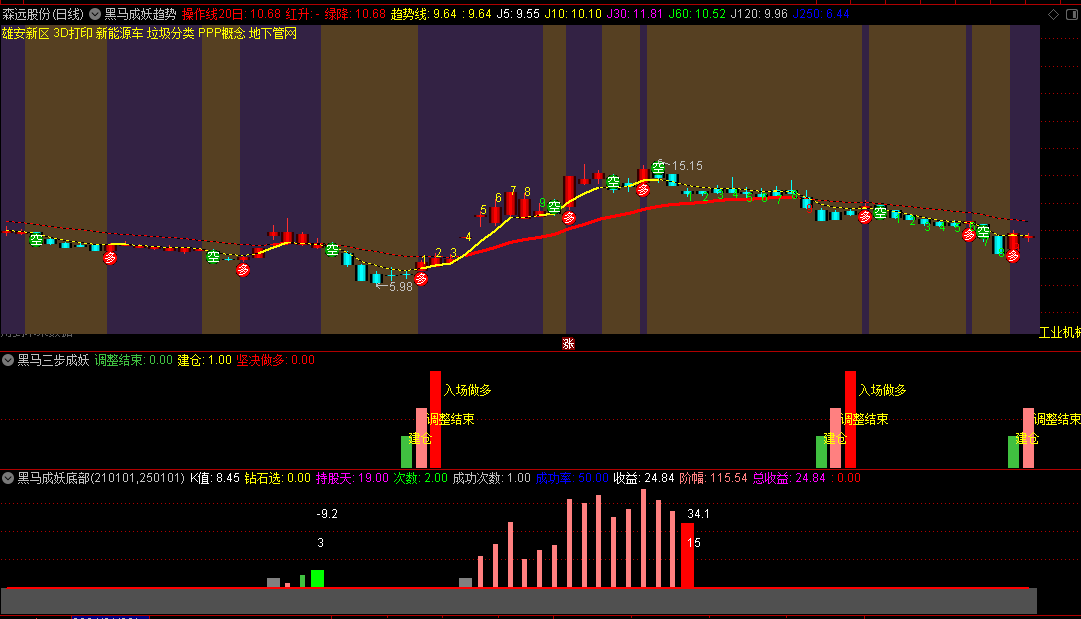 再者,黑马三步成妖副图选股指标由三个关键信号组成:调整结束、建仓以及入场做多。调整结束信号出现时,投资者需结合股价位置和筹码分布等因素进行判断;建仓信号一旦出现,对于激进的投资者而言,可以考虑介入;而当入场做多信号出现时,则意味着投资者应果断行动,但需注意涨幅,如信号本身已经涨幅过高,需注意风险。