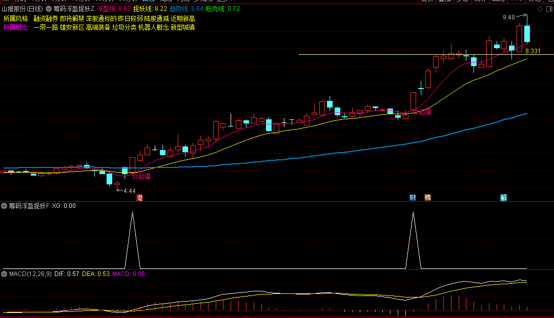 三条均线组成趋势判断依据,黄色横线为筹码最高峰画线,便于观察筹码峰上下移动。