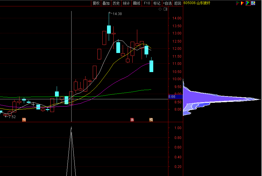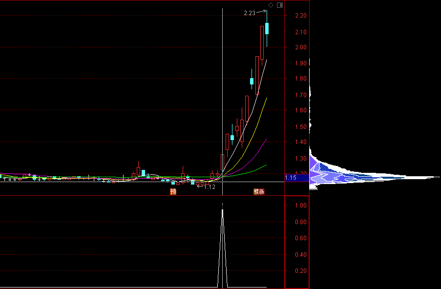 拉升阶段的主要任务就是使股价脱离庄家吸筹成本区,打开利润空间。在此过程中,庄家用部分筹码打压做盘,同时又承接抛压筹码,但其大部分筹码仍旧按兵不动的锁定在吸筹区域,等待拉高获利卖出。在拉升过程中,部分股民纷纷追涨,同时部分股民获利吐出。对于坐庄技巧较好的庄家,如有大势配合,庄家只需要点上一把火,拉升工作主要是由股民自行完成的,其间,庄家主要利用控盘能力调控拉升节奏。在拉升阶段,成交异常活跃,筹码加速转手,各价位的成本分布大小不一。