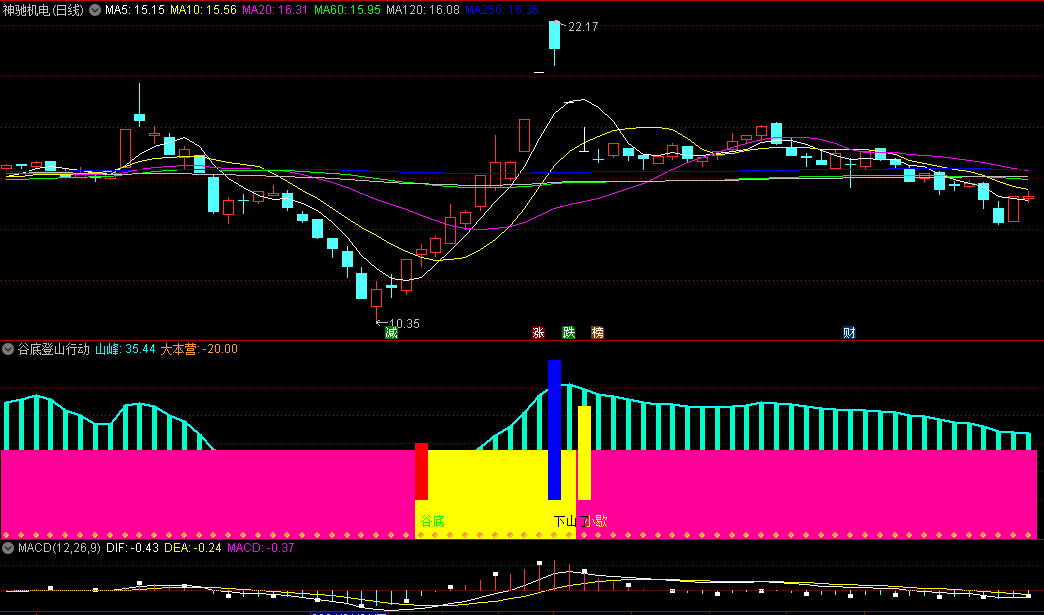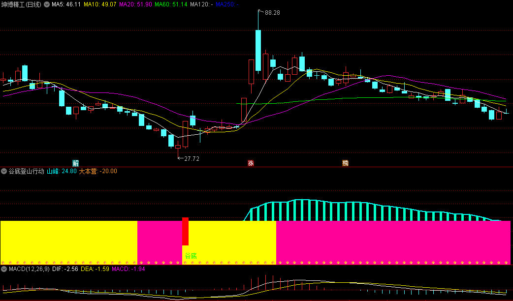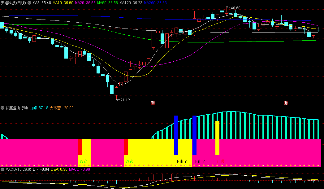 谷底登山行动副图指标用法说明:出现“谷底”是底部预警,出现“山顶”是顶部预警,出现“下山了”蓝色柱,是卖出预警。