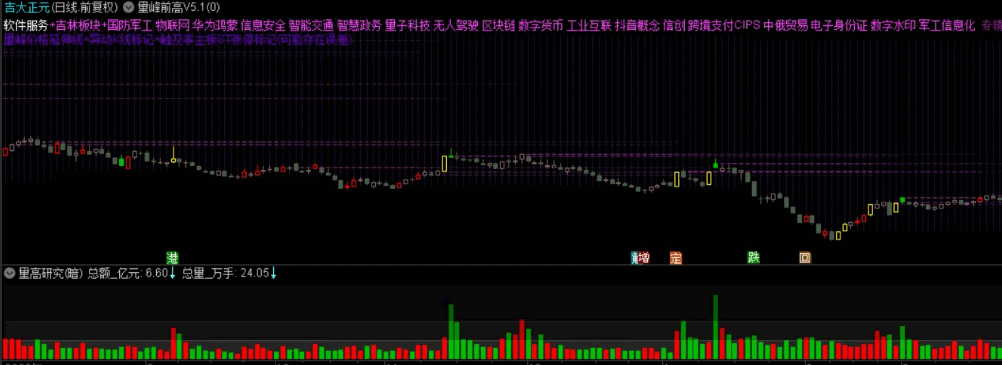 ↖2024年4月,吉大正元主图示意(量峰前高V5.1,参数LINES=0,隐藏均线)
