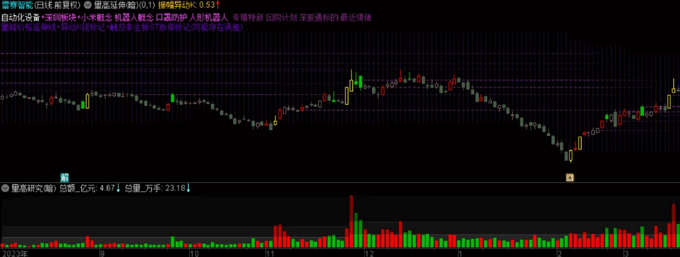 ↖2024年4月,雷赛智能主图示意(量峰前高V5.1,参数LINES=0,隐藏均线)